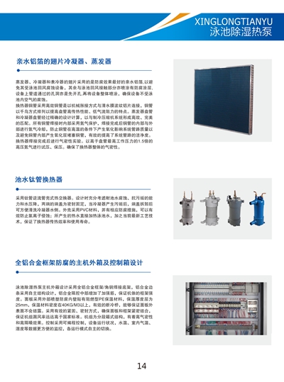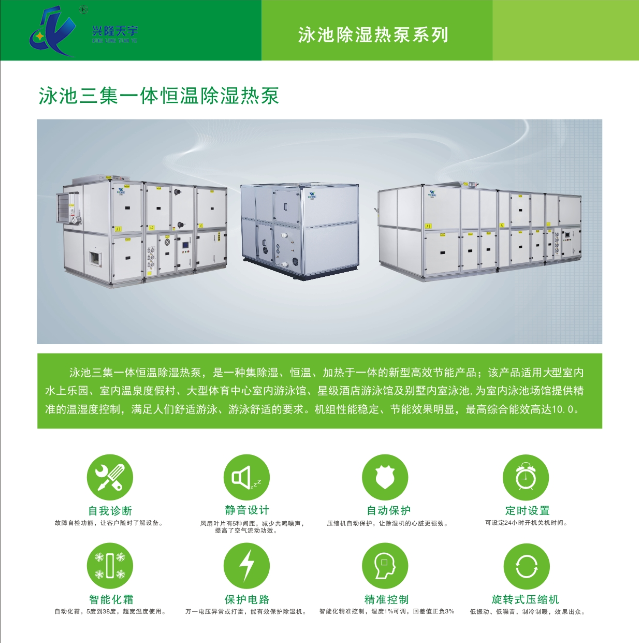 2、室內(nèi)恒溫泳池空間的暖濕空氣經(jīng)由回風(fēng)管道引至設(shè)備的回風(fēng)口,流經(jīng)設(shè)備蒸發(fā)器,使暖通空氣溫度下降,空氣中的水汽降溫凝結(jié)成水滴從空氣中分離出來,實現(xiàn)空氣除濕功能。在暖濕空氣降溫、水汽凝結(jié)(相變)的過程中釋放出的顯熱和潛熱被制冷劑吸收。制冷劑吸收的熱量經(jīng)池水冷凝器加熱池水,實現(xiàn)池水加熱功能;經(jīng)空氣再熱冷凝器加熱冷卻的空氣,實現(xiàn)空氣再熱功能;經(jīng)室外風(fēng)冷冷凝器或水冷冷凝器將熱量出,實現(xiàn)空調(diào)制冷功能。