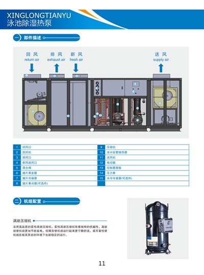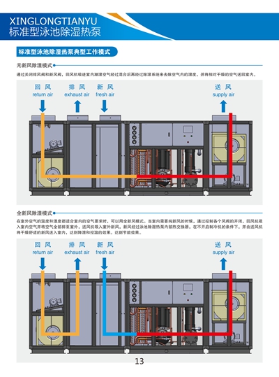 冬季當(dāng)除濕熱泵所產(chǎn)生的熱量不足以滿足要求時,外接熱源通至機(jī)組自帶的冷熱兩用盤管內(nèi)輔助制熱。夏季也可向冷熱兩用盤管通7/12℃冷凍水輔助制冷。設(shè)備帶新風(fēng)、排風(fēng)接口,通過新風(fēng)、排風(fēng)管道接入室外,通過排風(fēng)管道排出室內(nèi)部分渾濁空氣,通過新風(fēng)管道引進(jìn)室外新鮮空氣,保證室內(nèi)空氣品質(zhì)。